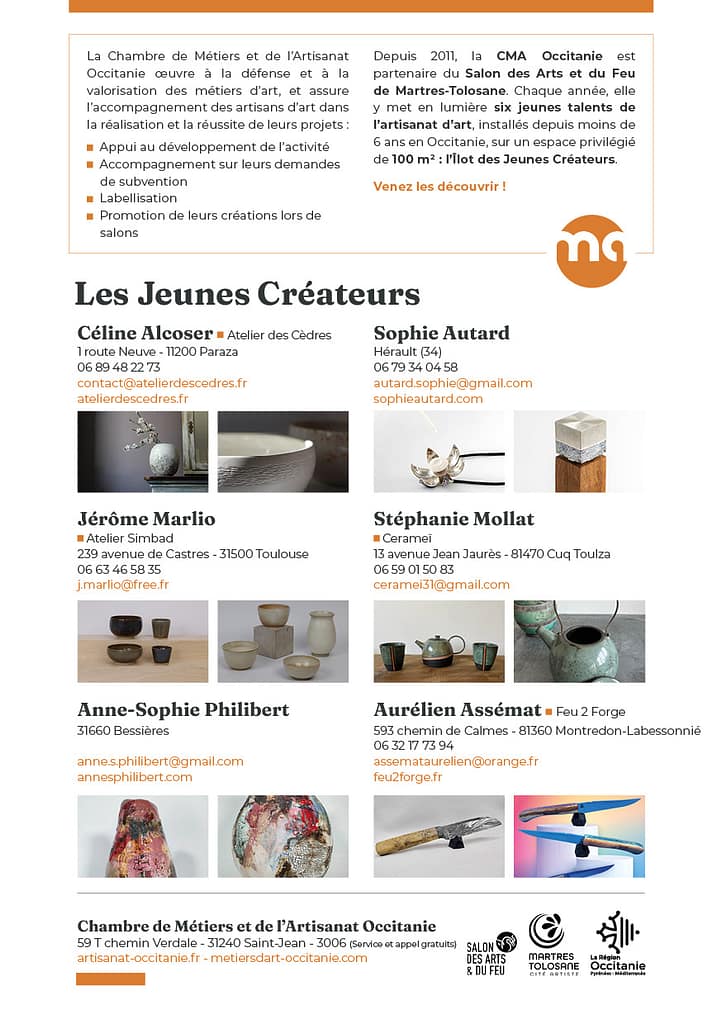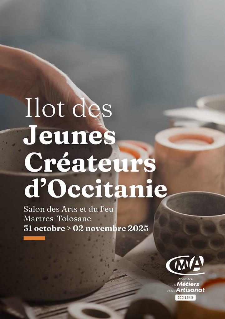 Partenaire historique du Salon des Arts et du Feu de Martres-Tolosane depuis 2011, la CMA contribue chaque année à la mise en valeur de nouveaux talents. Sur un espace dédié de 100 m², l’îlot des Jeunes Créateurs met en lumière six artisans d’art récemment installés en Occitanie. Cet espace est plus qu’une vitrine : c’est un tremplin, une passerelle entre la tradition et l’innovation, entre le geste et la création contemporaine.