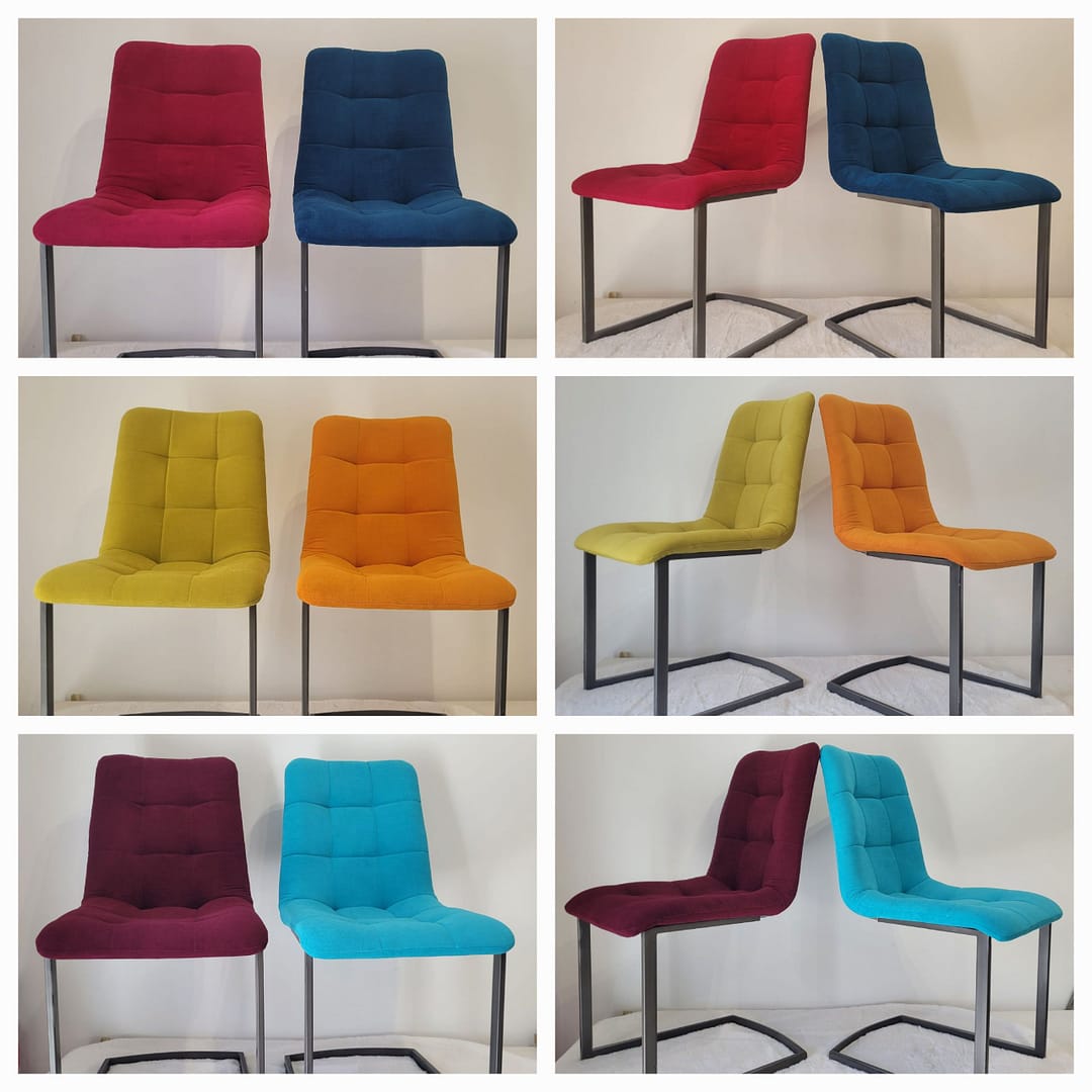 Chaises de salle à manger contemporaines restaurées. Le tissu simili cuir d'origine a été remplacé par un tissu uni et facile d'entretien "easyclean".