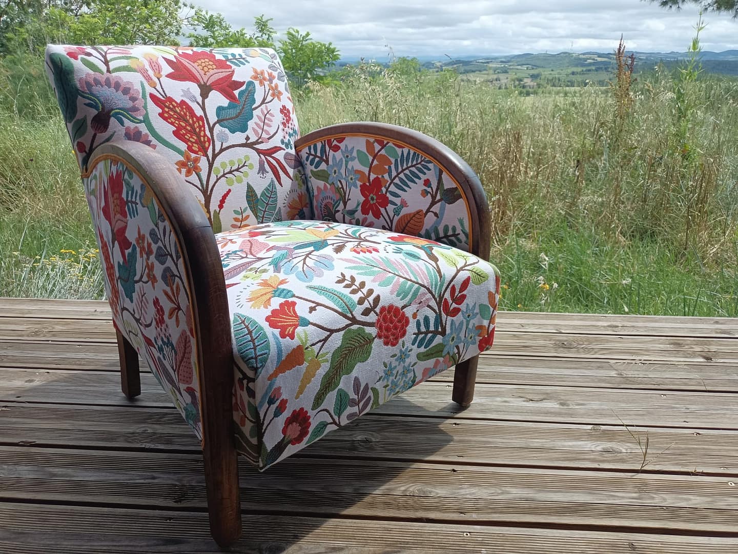 Fauteuil Art Déco des années 30 restauré avec une garniture traditionnelle en crin végétal et recouvert d'un tissu fleuri et brodé lui conférant style et élégance.