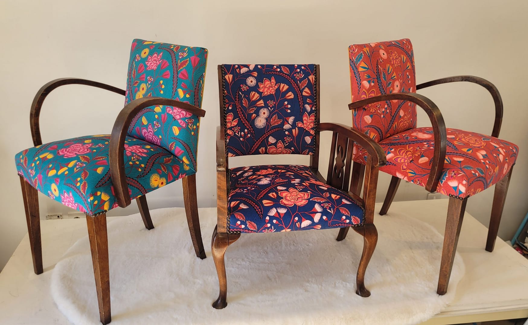 Fauteuils bridges et fauteuils anglais restaurés avec une garniture traditionnelle en crin végétal et finition clous tapissiers bronze.