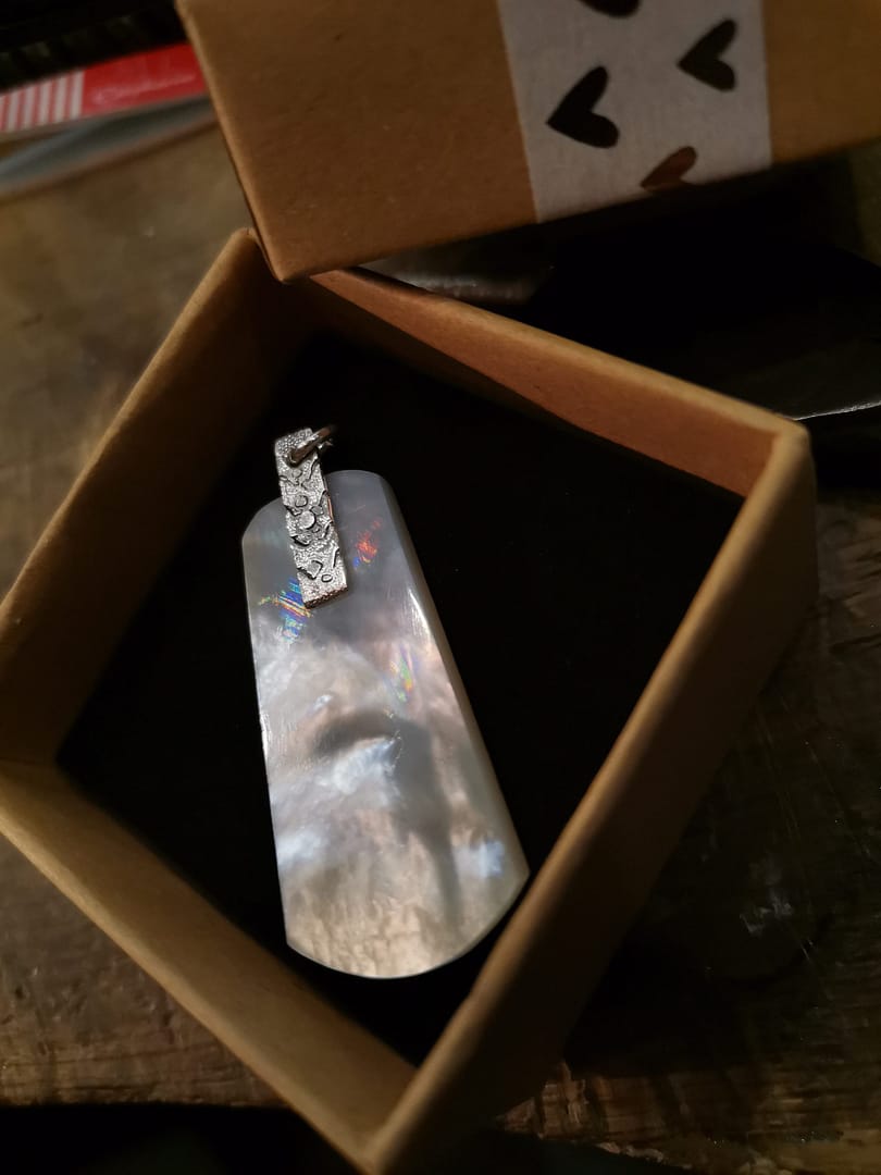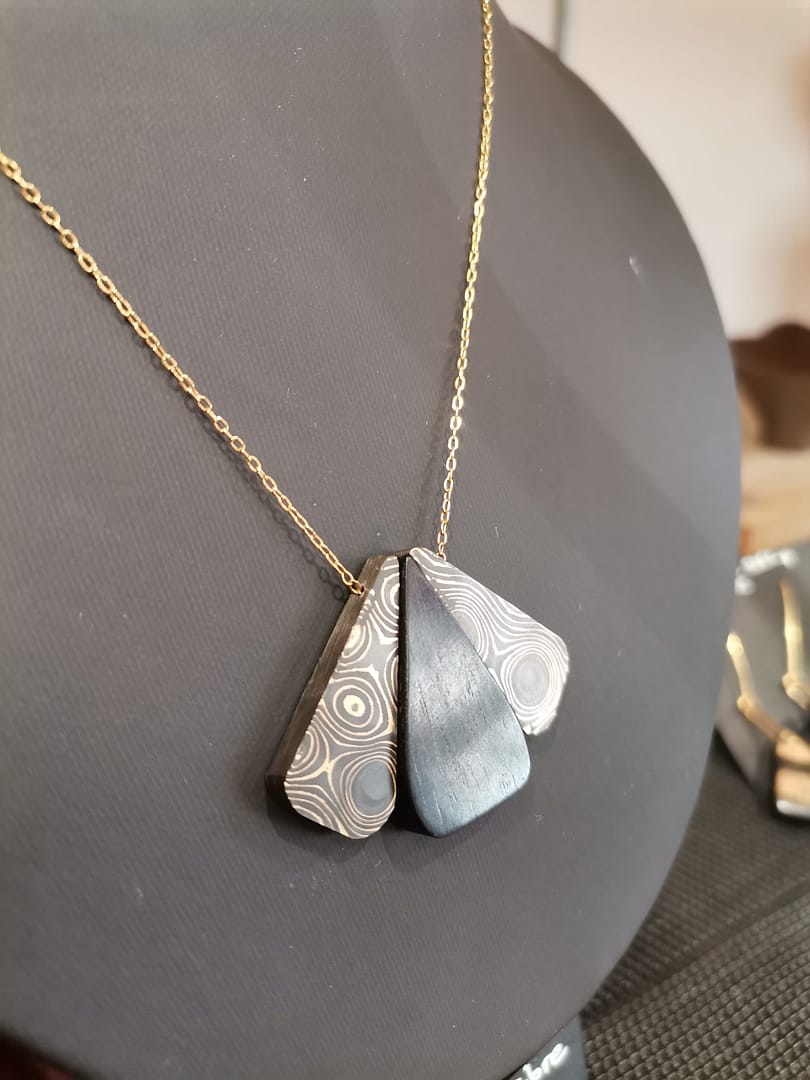À Laguiole, depuis 2009 , inspirée par les techniques de la coutellerie , je travaille la matière comme on cherche la lumière. Les chutes issues des coutelleries locales — corne, bois, acier damas, nacre — portent déjà une profondeur, une présence presque minérale. Je les façonne, je les perce , je les rivète, je les grave parfois, je les polis, jusqu’à ce que la surface capte, reflète ou absorbe la lumière.