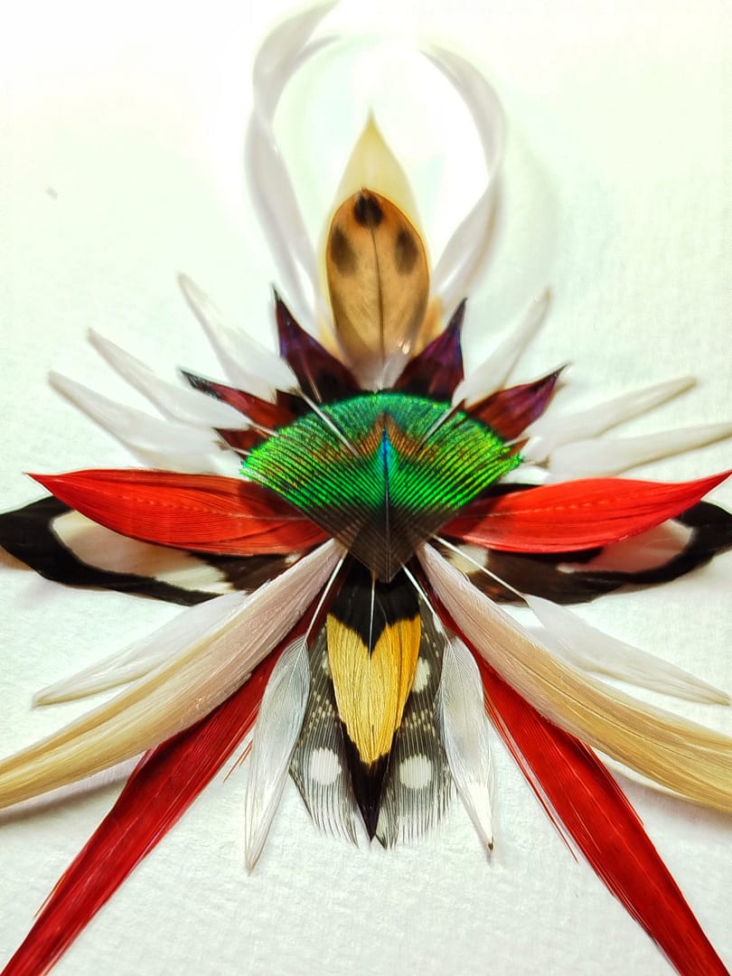 Je réalise exclusivement des pièces uniques : parures, objets décoratifs et créations artistiques, pensées comme des œuvres à part entière. Mon univers se distingue par une approche contemporaine de la plumasserie, respectueuse des matériaux et profondément inspirée par la nature, le vivant et la transformation.