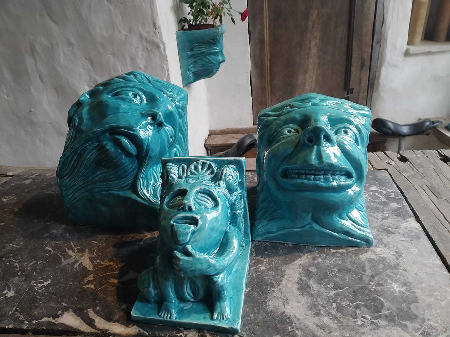 Photogrammétrie (Meshroom), sculpture logicielle ( Blender), impression 3D, création de moules en plâtre, coulage des barbotines, nettoyage et recréation des détails estompés sur la terre brut, cuisson du biscuit puis cuisson d’émaillage.