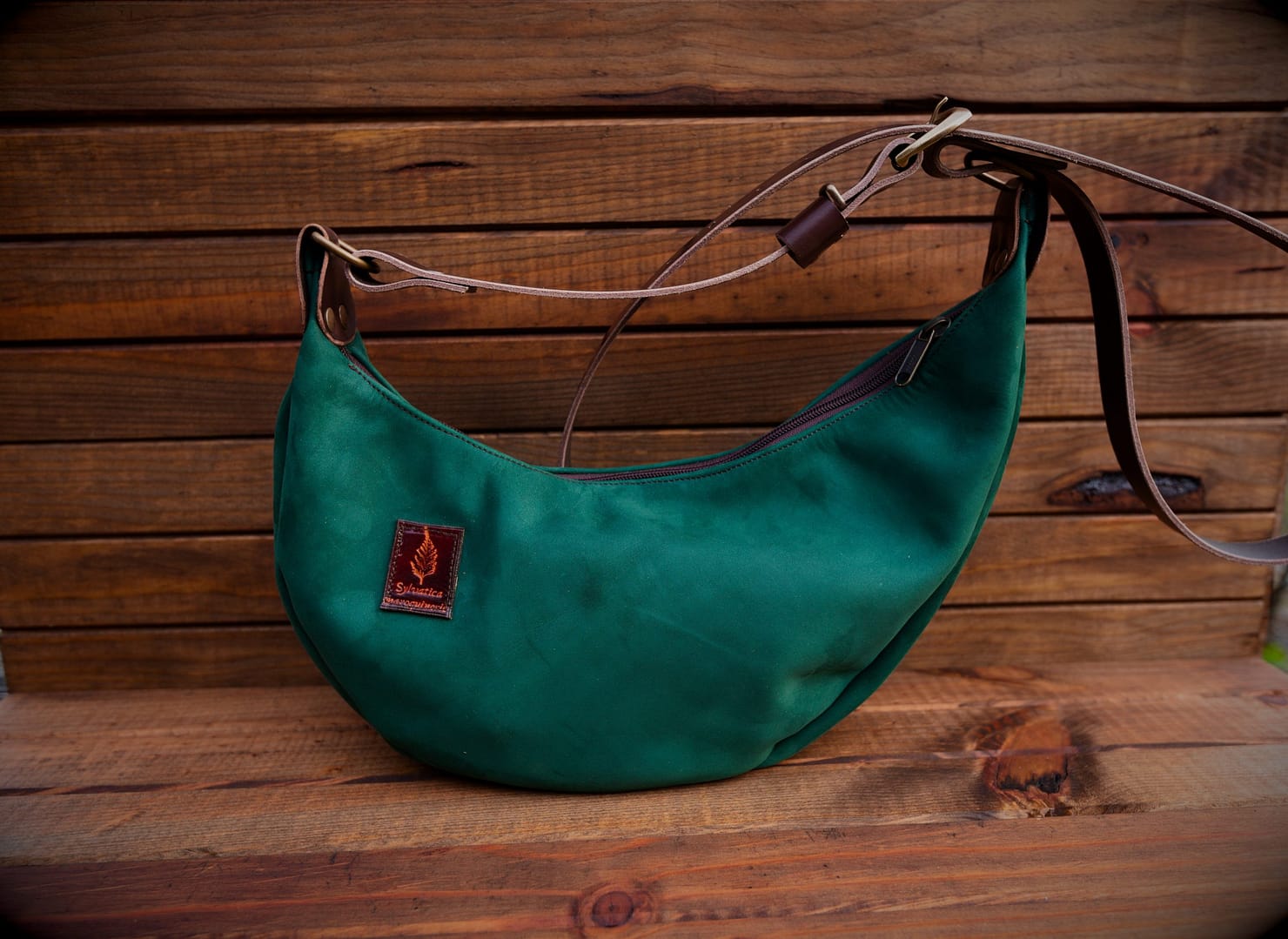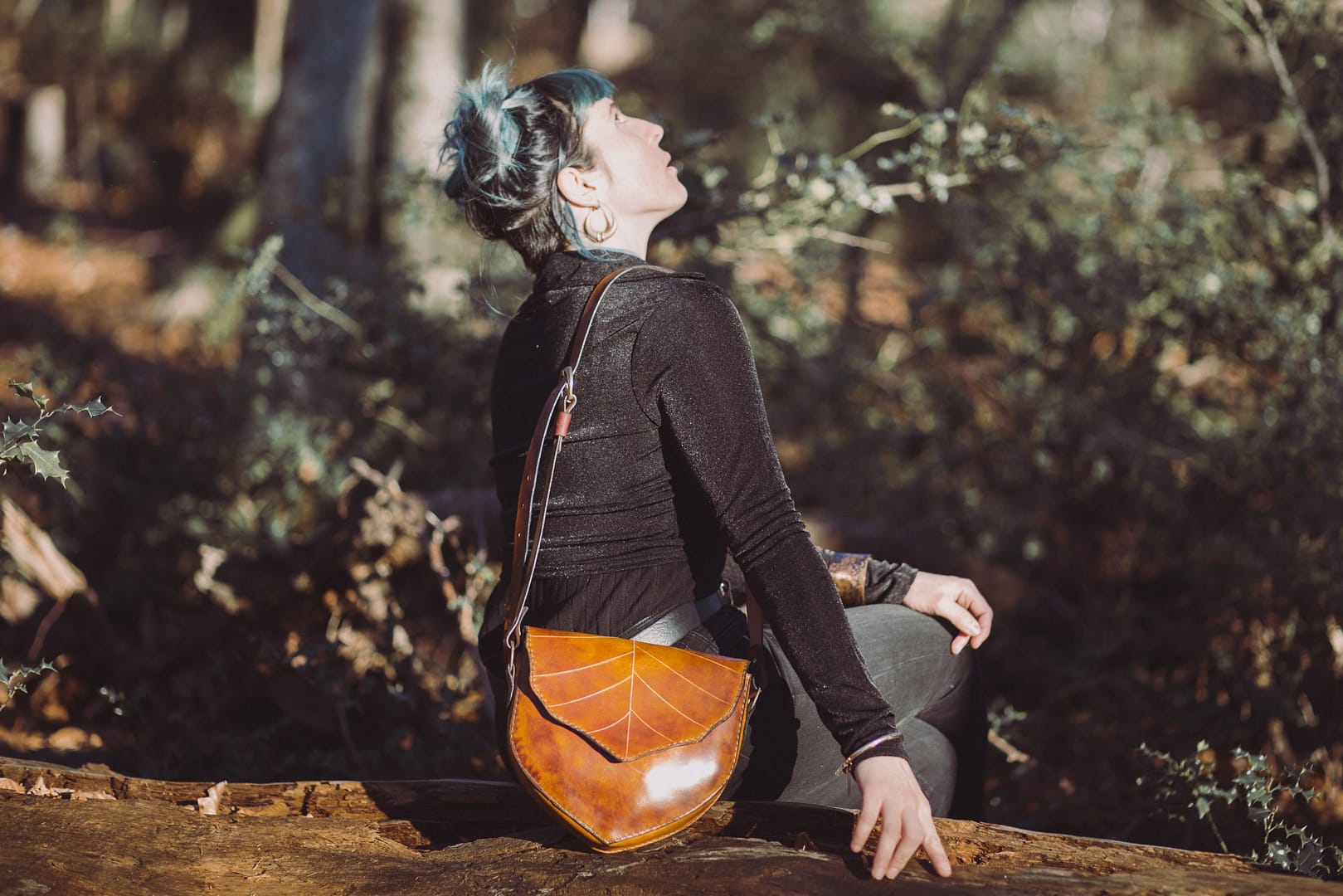 L’inspiration naturelle est très présente dans mon travail, particulièrement sur les sacs en forme de feuille, teintés à la main pour obtenir des nuances qui imitent une feuille de hêtre en automne. Ils sont aussi cousus à la main, car ce style de sac le demande.